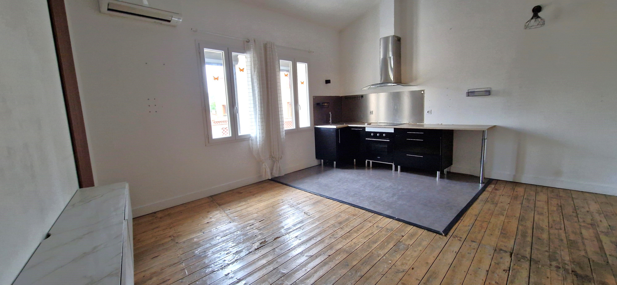 Proche de toutes commodités mais non enclavé dans le centre ancien, Maison de Village traversante rénovée de façon moderne style loft avec des plafonds rampants. Elle est sur 2 faces, et donc on a 2 entrées (soit par le garage avec un escalier intérieur pour relier l’habitation avec l’isolation prévue entre le garage et le séjour) Et la deuxième entrée à l’arrière ou du coup on arrive en plain pied sur l’habitation, directement au niveau du séjour. Rez de chaussée : garage de 42 m2 avec porte électrique Rez de chaussée par l’autre rue : Hall d’entrée avec wc sur la gauche Agréable pièce de vie de 25 m2 façade dégagée ouest ( climatisation réversible et double vitrage) – cuisine équipée à l'américaine 1 chambre 1 salle d’eau Au 1 er étage 1 chambre et un bureau pouvant accueillir un couchage ou un bureau (grand vélux électrique avec volets) + Climatisation réversible au niveau de l’étage 106 000 € DPE en cours
